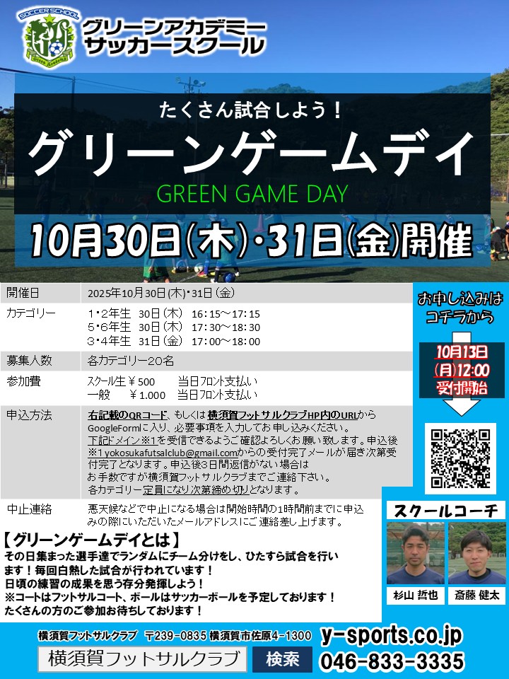 10月ゲームデイ開催! 2025.10.13 10月に小学生対象のサッカースクールイベント【グリーンゲームデイ】を開催します!詳細はPDFをご確認ください。たくさんの方のお申し込みをお待ちしております! お申し込みはコチラ