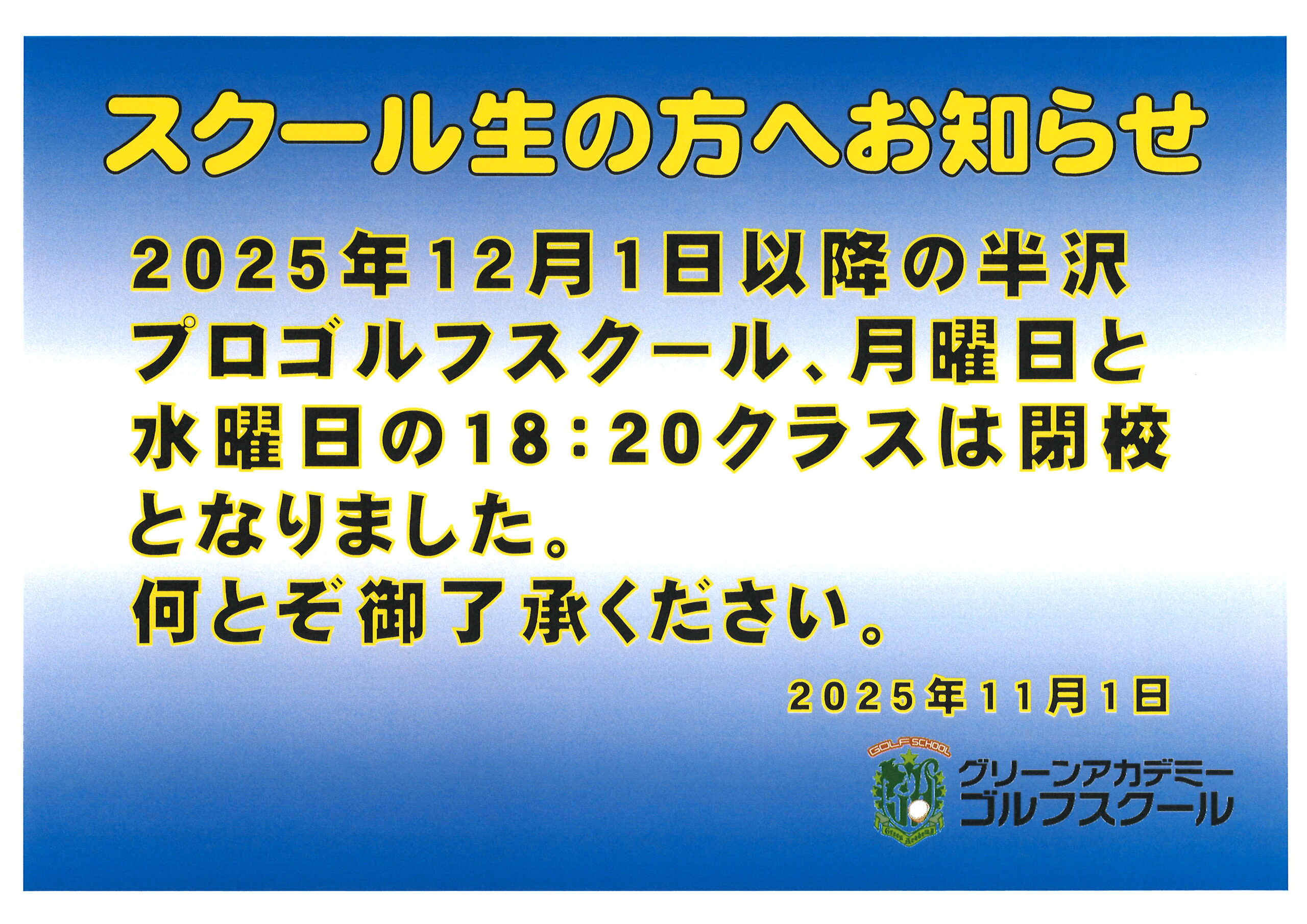 グリーンアカデミーゴルフスクール 休講情報更新しました。 2025年11月26日 グリーンアカデミーゴルフスクール 休講情報更新しました。 https://y-sports.co.jp/ygg/sch/type2.html